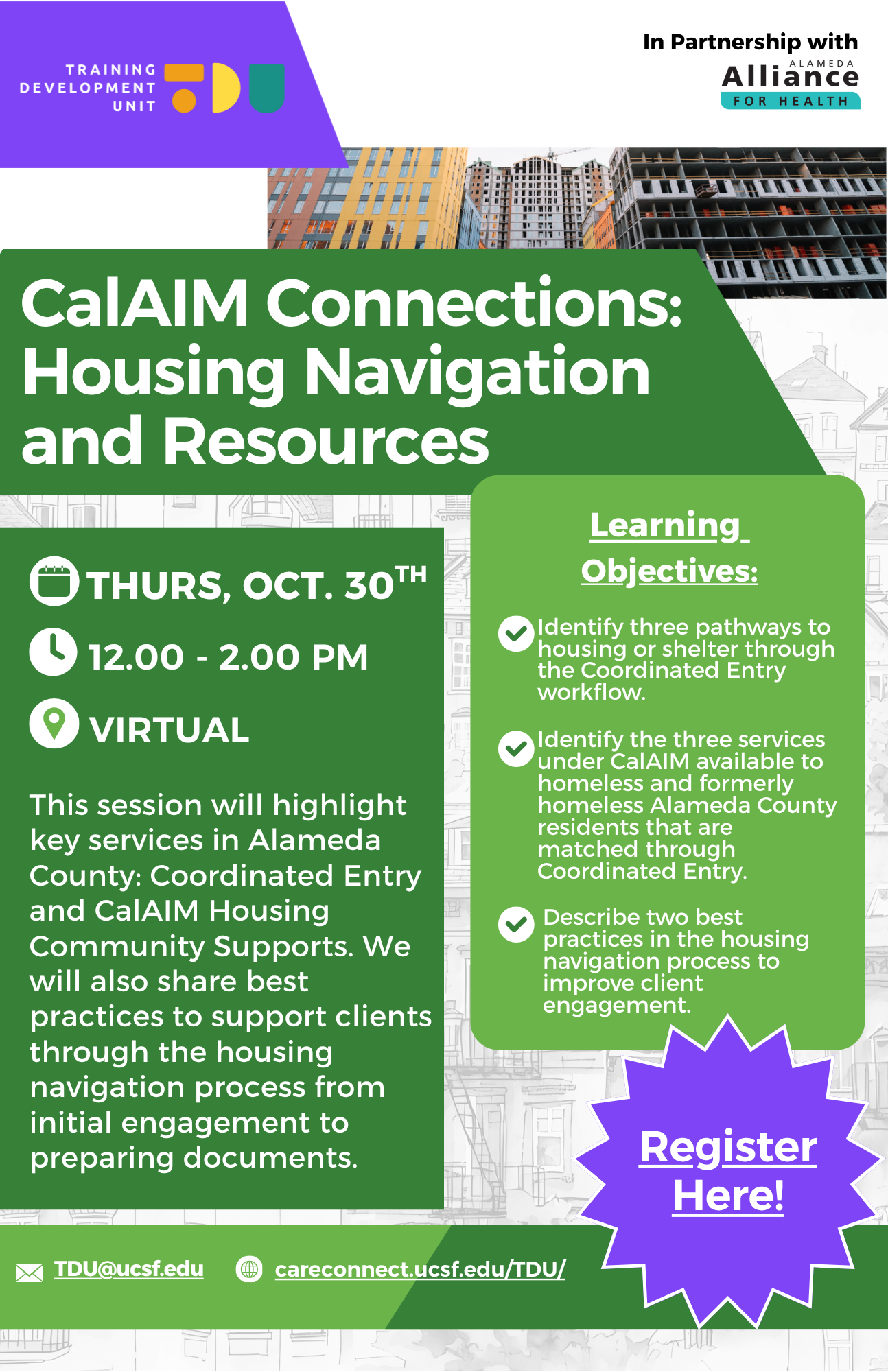 The Training Development Unit (TDU), a project of the Training & Health Equity Collaborative, is funded through Anthem Blue Cross and Alameda Alliance for Health. The TDU provides training and technical assistance to Enhanced Care Management and Community Supports within Alameda County, Los Angeles County, and the Central Valley to increase their knowledge of CalAIM, services for eligible clients, hone consumer engagement skills, support professional development for team members, and strengthen workforce retention. In addition, the TDU provides marketing, registration, virtual session support, materials development, and evaluation for all training offerings.